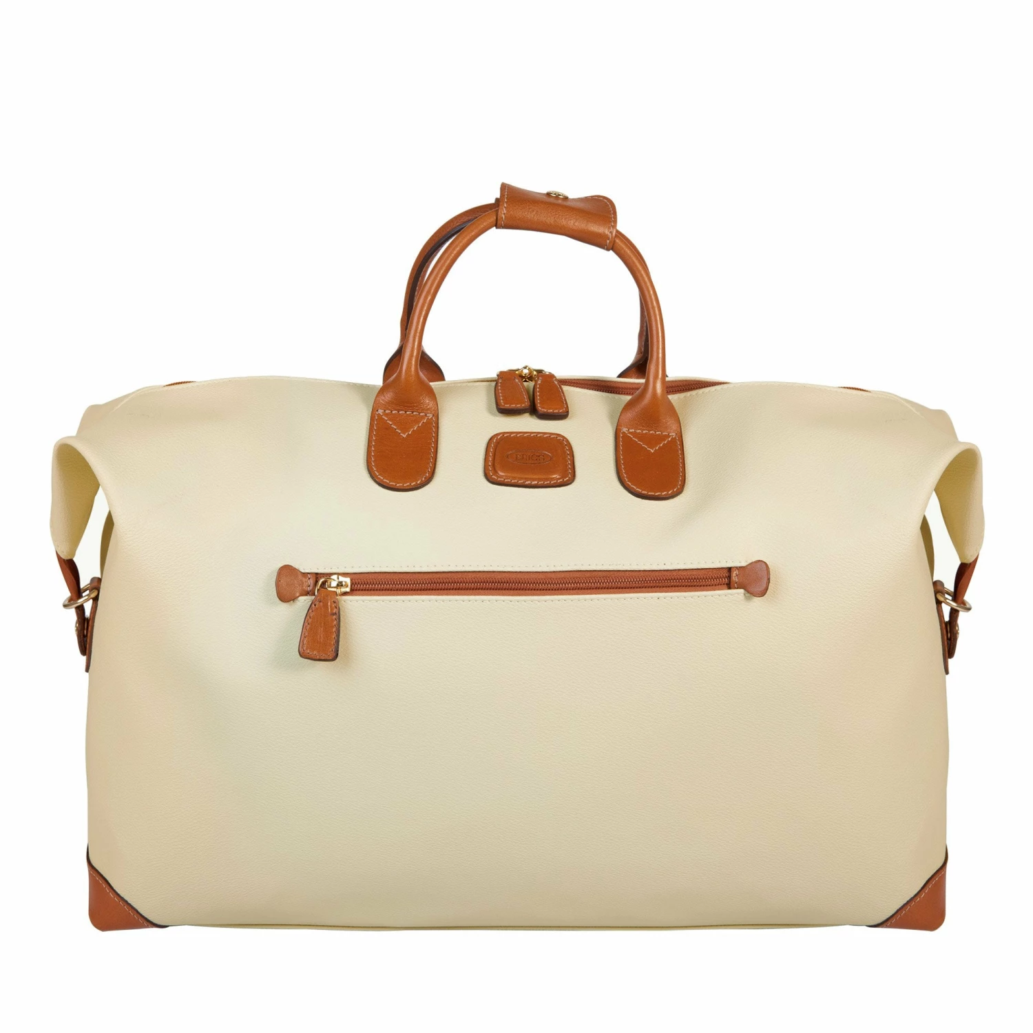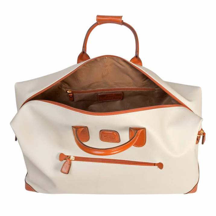 The Firenze 22″ Cargo Duffle is handcrafted using durable, easy to clean, embossed leather-like PVC with vegetable tanned leather trimmings. This classic holdall is offered in a signature Cream color way. BRIC’S Firenze offers an assortment of travel items that look good and travel even better. The interior lining features a BRIC’S logo jacquard print that is also water-proof. Toss our trusty duffle bag into the backseat, and head out on the open road. This is the must-have road trip travel bag.