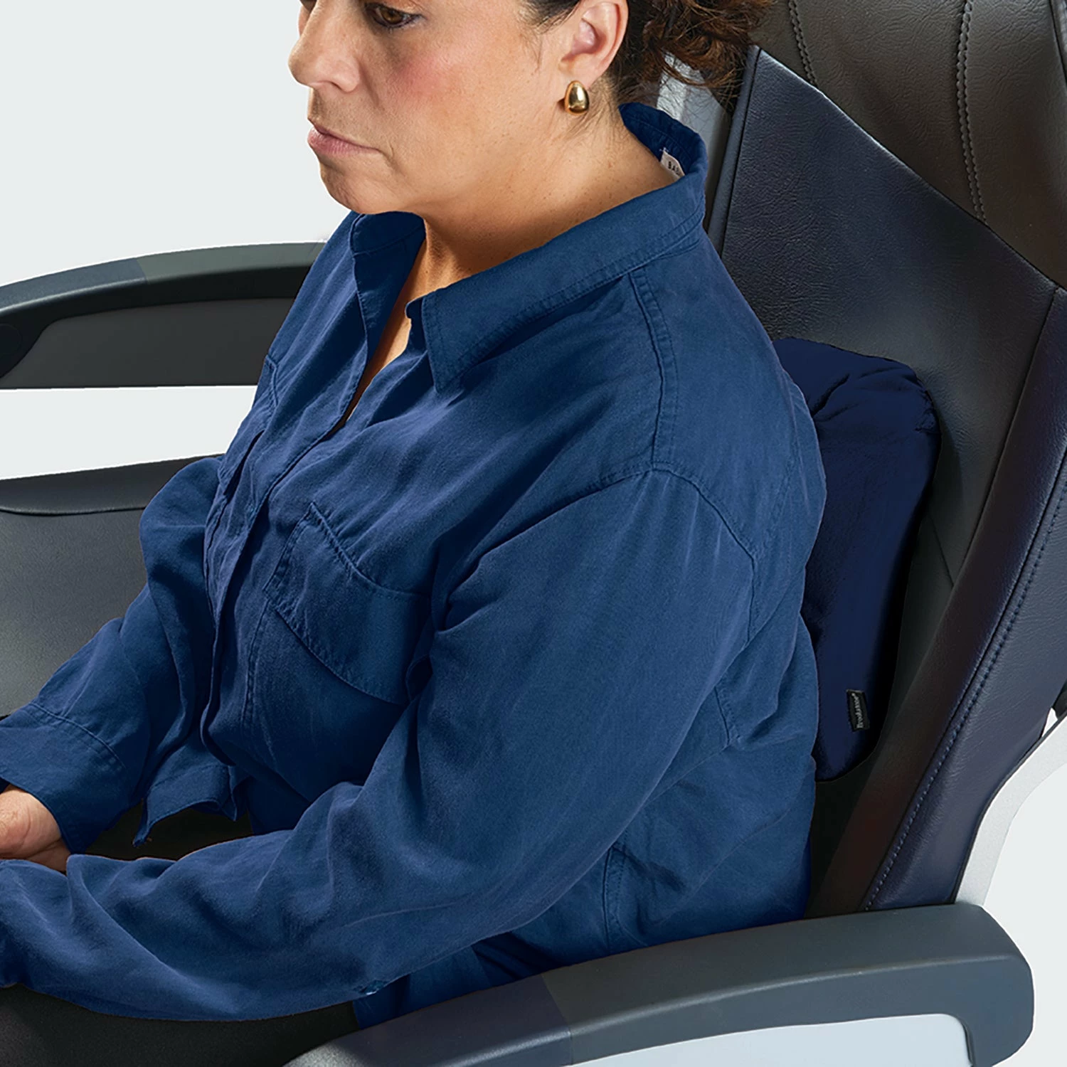 This pillow conforms to the shape of your head and neck. Developed with high quality memory foam, the slim back design helps keep your head from falling back while the high side curved shape provides cushioned neck support. Can easily be converted into a lumbar support pillow as well.