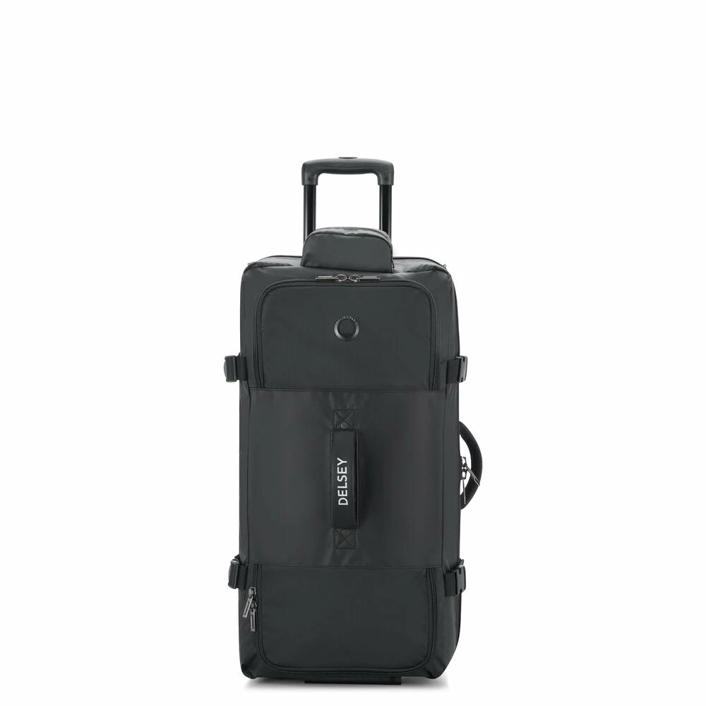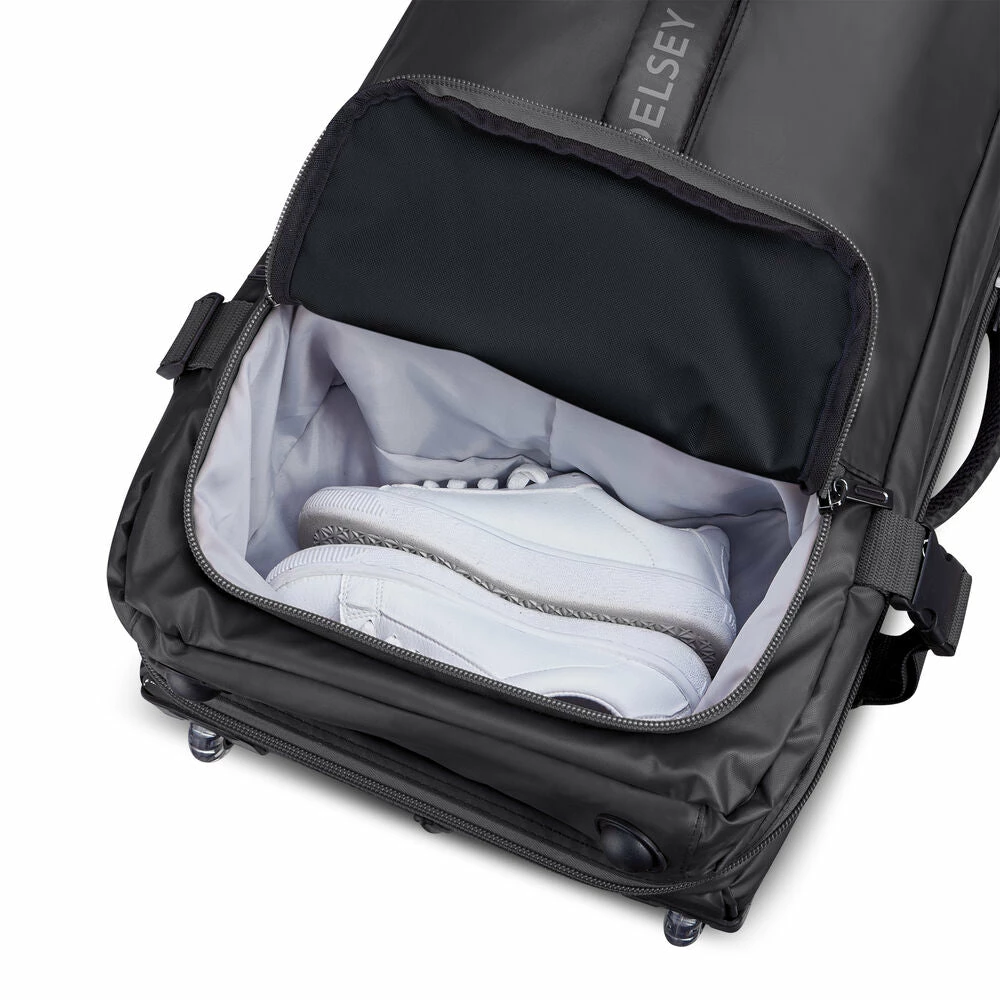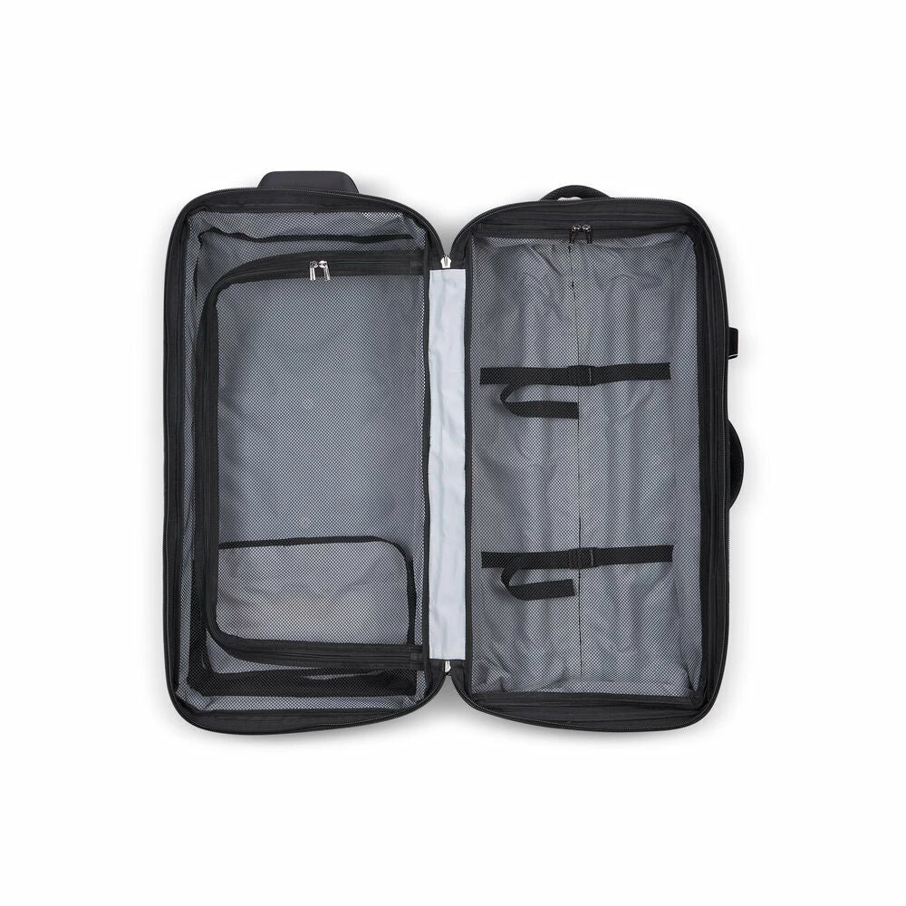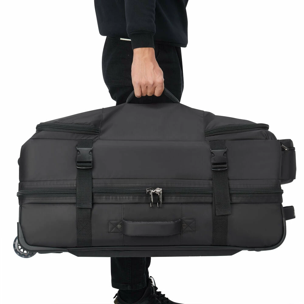This large-size rolling duffel is perfect for any trip. It includes a 50-50 opening with two equal size compartments for easy organization as well three exterior pockets: two large ones to store shoes, a sweater or return-home laundry and a smaller one that can be used for small accessories and valuables.