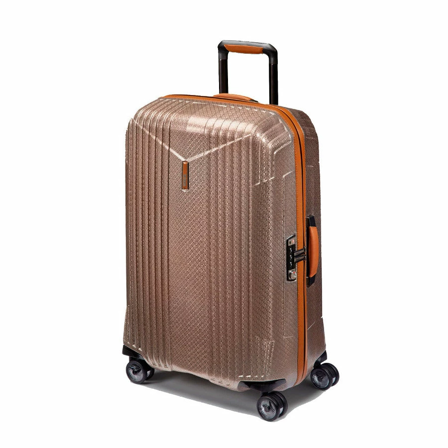 The zenith of lightweight travel arrives with the Hartmann 7R 27″ Hardside Spinner Checked Luggage with contrasting trim. Modern design, ultra lightweight, exceedingly durable metal Curv material, and the craft of leather intersect with this evolutionary collection. For travelers who know they have arrived, 7R is engineered elegance.