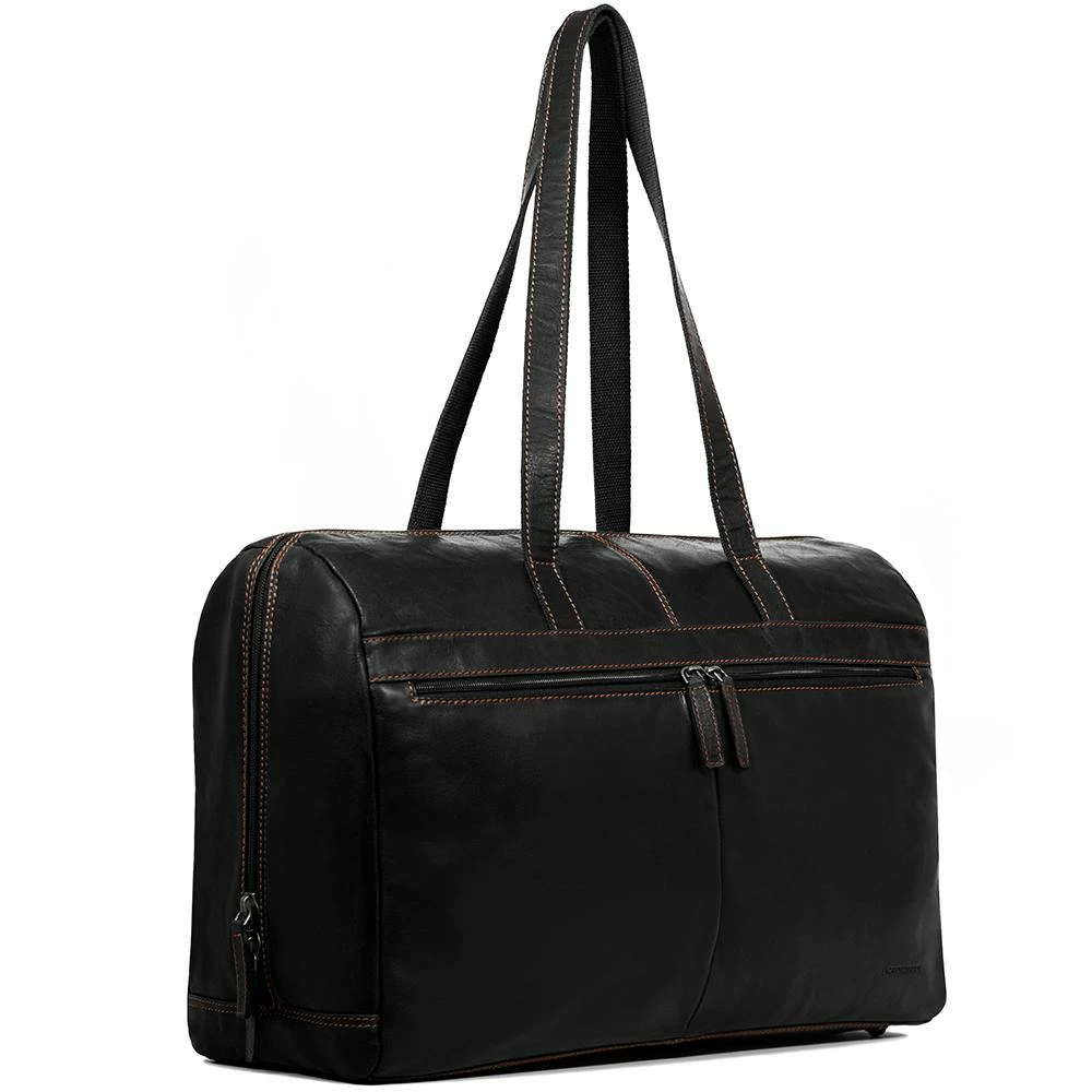 Pack your essentials for the day or for an excursion in this versatile Voyager Duffle Tote. This large bag is surprisingly lightweight and made from hand-stained full-grain buffalo leather that will build a rich patina as it ages. It has the right amount of space for anything that you may need to carry including your laptop and work items or your clothes, shoes, and personal items. Two zippered front pockets allow for quick access to items that you need to have at hand. A trolley strap on the back adds convenience while you travel and use the bag as your carry-on. A padded compartment securely holds laptops with up to 17″ screens or can be used to carry files and documents. The shoulder straps have cotton webbing on the backside for added strength and grip on your shoulder while remaining comfortable to wear. This hand made leather bag features: