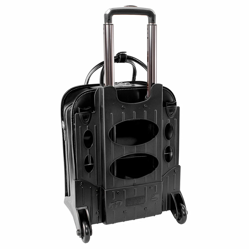 Patented 2-in-1 Detachable Wheel and Handle System. Vertical, euro influenced design allows easier maneuvering in tight, crowded areas. Narrow design also benefits users who travel on planes with the ability to maneuver down aisles without having to lift the bag. Stylish, flap-over front pocket for files and accessories with secure clasp and twist lock. Secure, centered zipper pocket within the main compartment. Main compartment features a padded laptop section that fits and protects most laptops up to 15″ screen size. Main compartment also features an interior organizer, interior padded zipper pocket for tablet cases, and space for files. Smart Attachment Strap allows piggy-backing on extended handles of other rolling cases & luggage. Adjustable, non-slip, shock absorbing shoulder strap alleviates body strain. Bonus, Protective Weatherproof Cover.