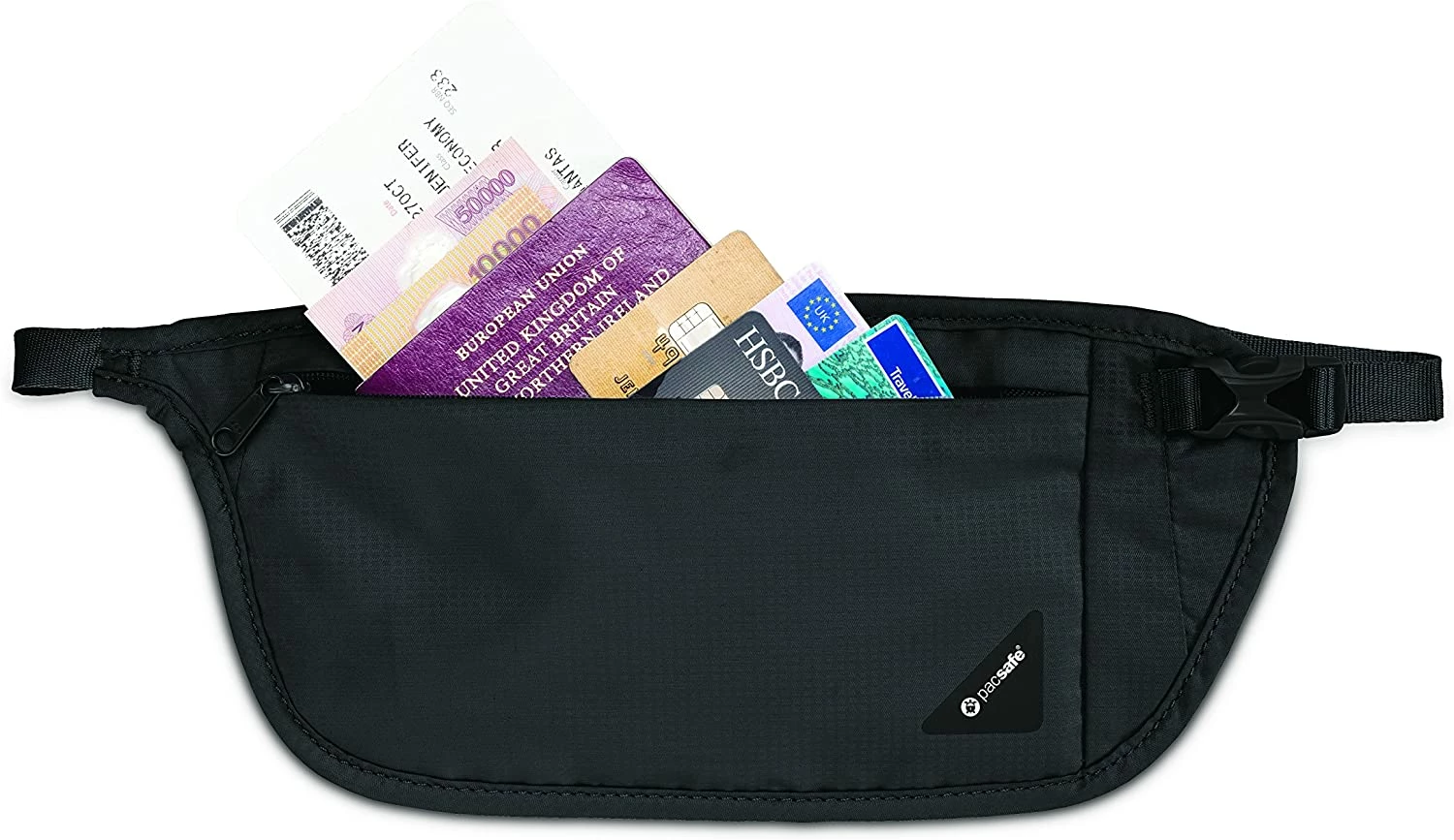 Secure your passport, cash and cards in this handy waist wallet that rests comfortably beneath your clothes. Made from RFIDsafeâ„¢ material to shield your personal details against unwanted scans. Safe Travels.
