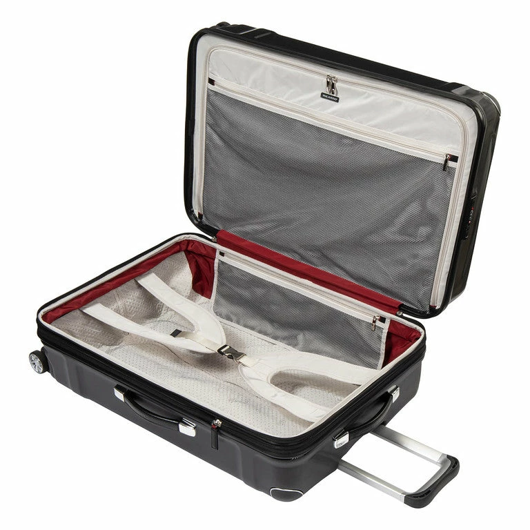 With an extra-generous packing area for your extended trips, this attractive large-sized suitcase is meant to be checked while resisting stretches from handling to maintain its pristine appearance. Designed for modern explorers with a taste for refined craftsmanship and engineered with a nearly indestructible Makrolon® by Covestro polycarbonate exterior, this exceptional case also offers smooth, ergonomic handling, a well-organized interior (including a suiter system), and TSA-lock security—perfect for business, pleasure, and compliments on your good taste.