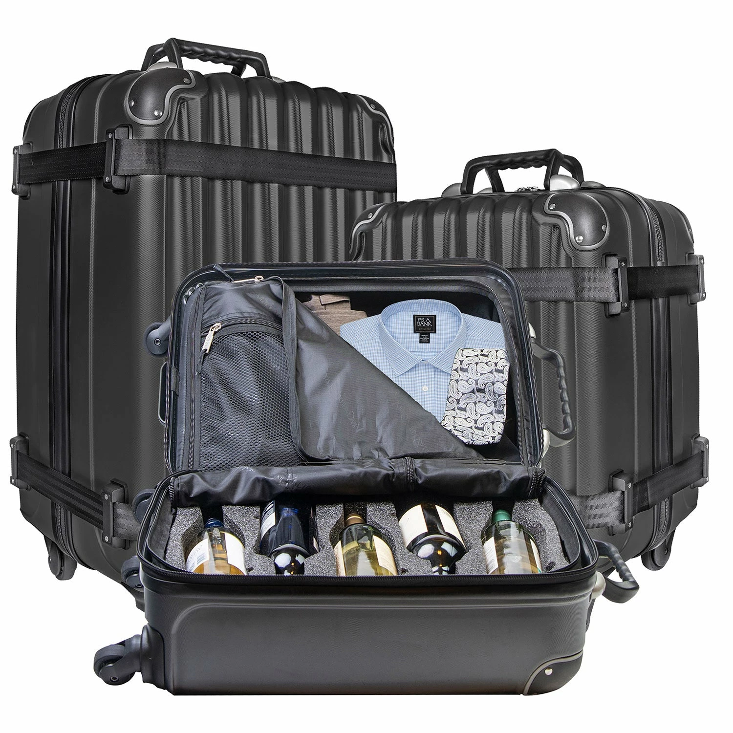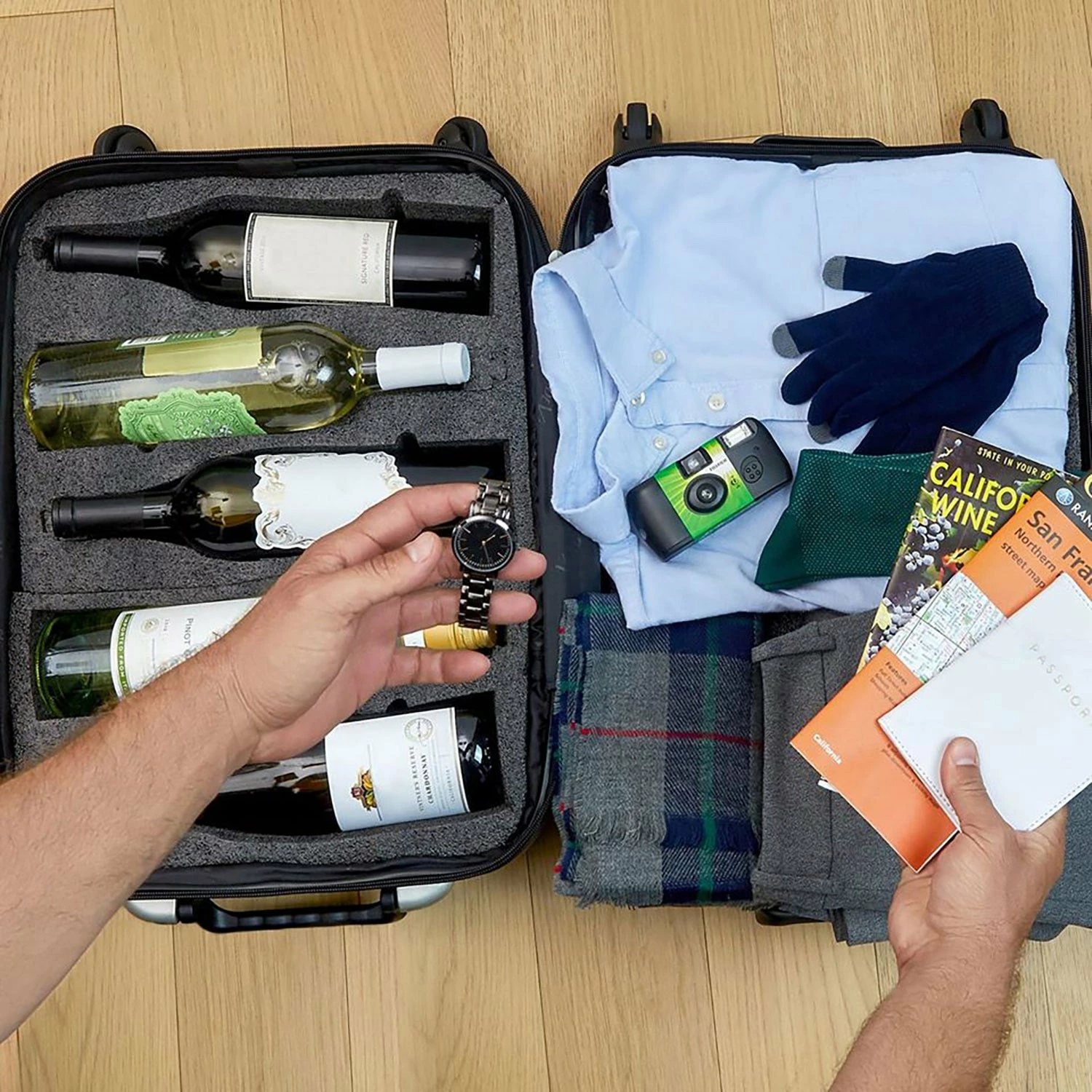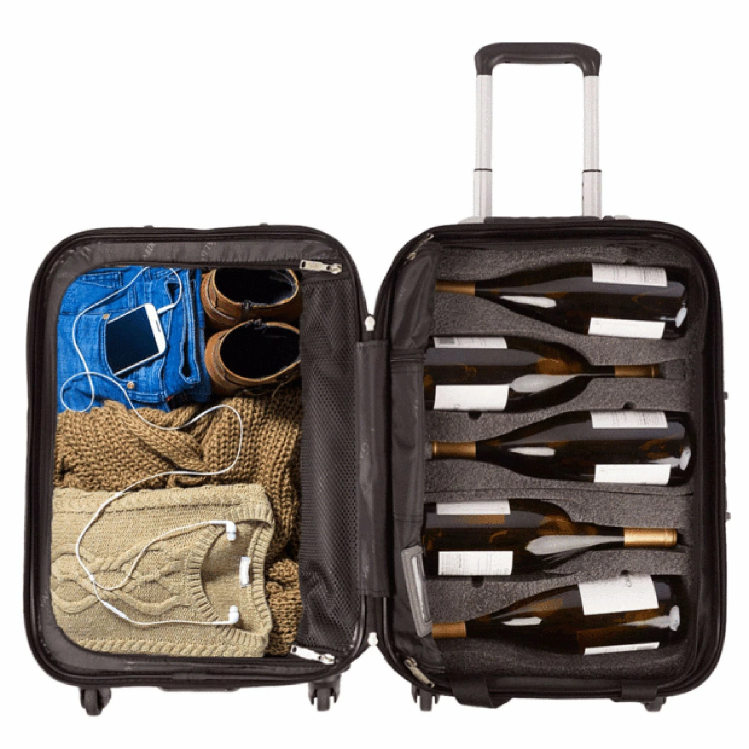 • Removable foam inserts are designed to hold a combination of 750ml bottles of almost any shape. The ability to fly with any combination of bottles from 2 to 5, Champagne to Riesling, makes this most versatile wine suitcase available.